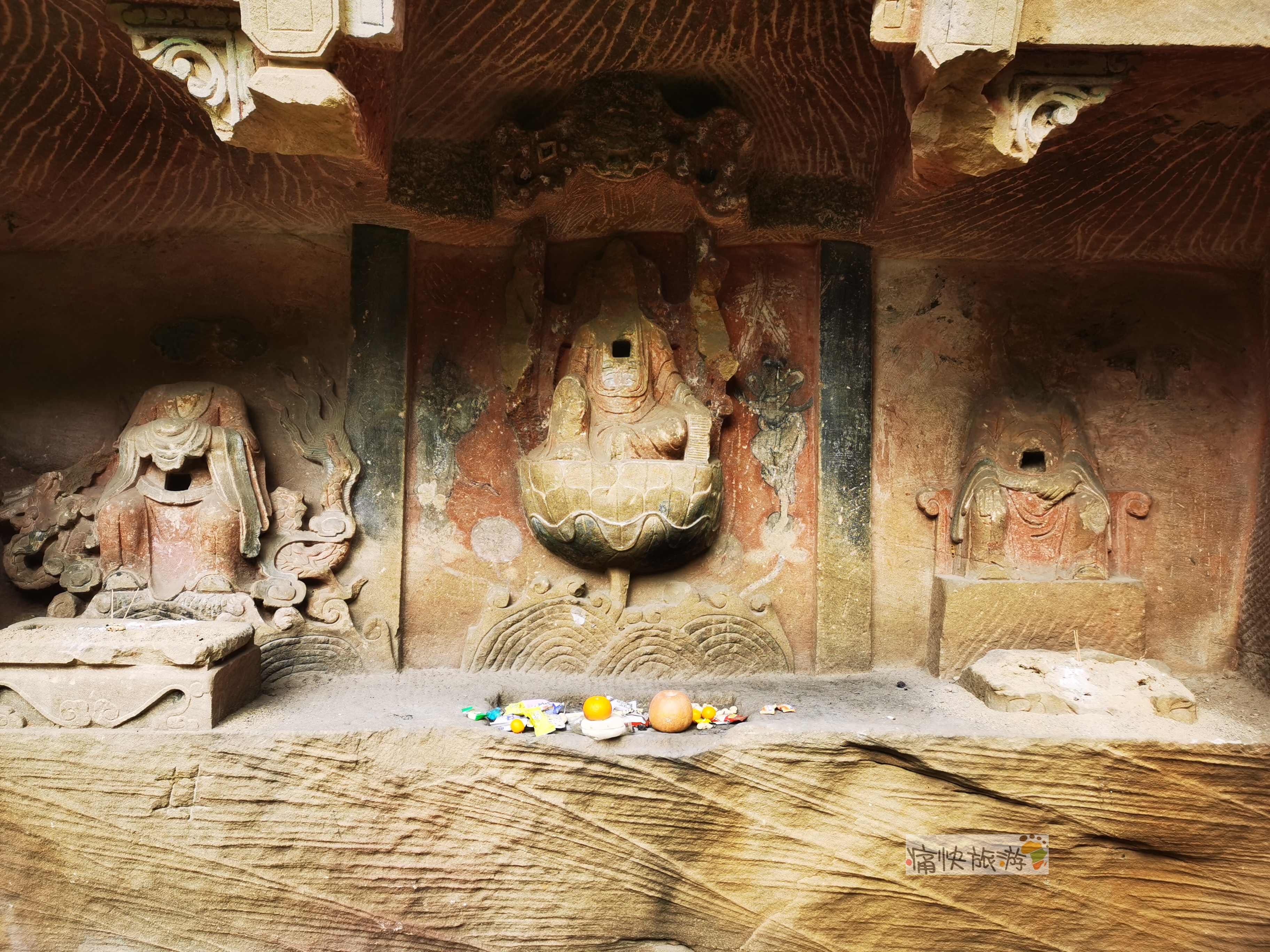 每尊造像的头部均已毁损,从造像上方对应的文字判断分别为龙王、观音和二郎神,是一个佛教和道教共龛。