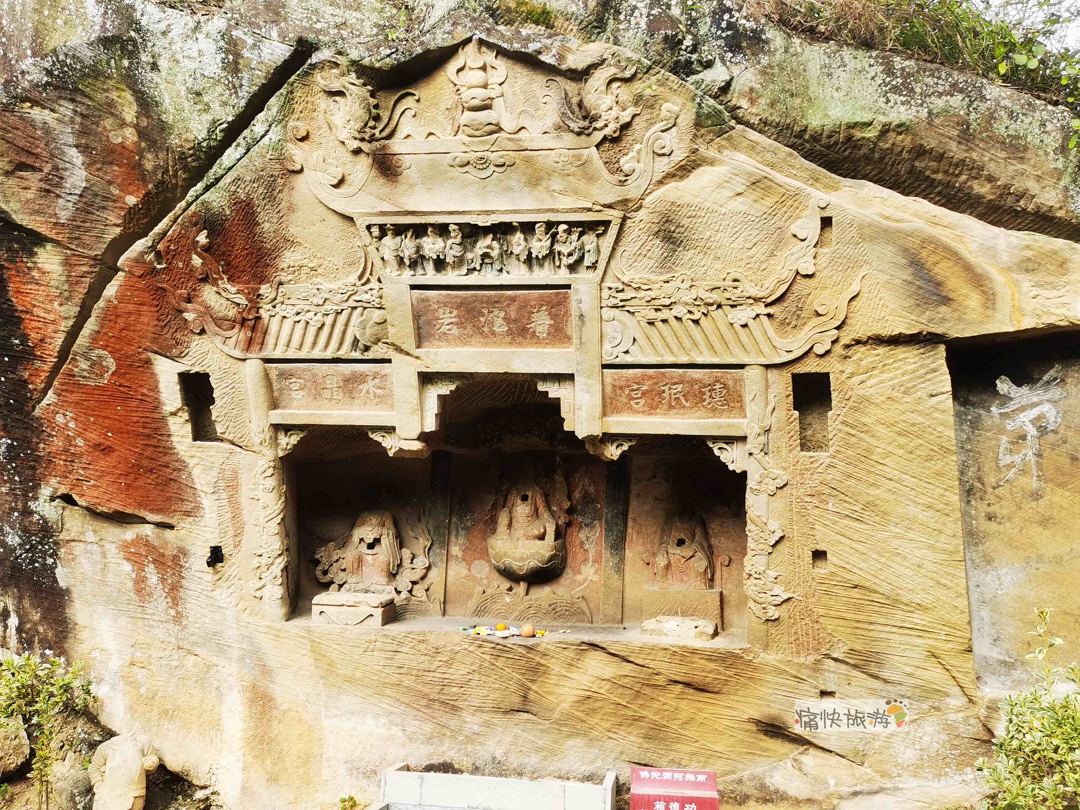 普沱岩摩崖造像规模虽然不大,工匠运用阳刻、阴刻等多种雕刻手法在岩石上立体展示出重檐歇山顶的殿宇,四柱三间上方分别对应着“水晶宫、普沱岩、璤珉宫”,尚存部分彩绘痕迹。