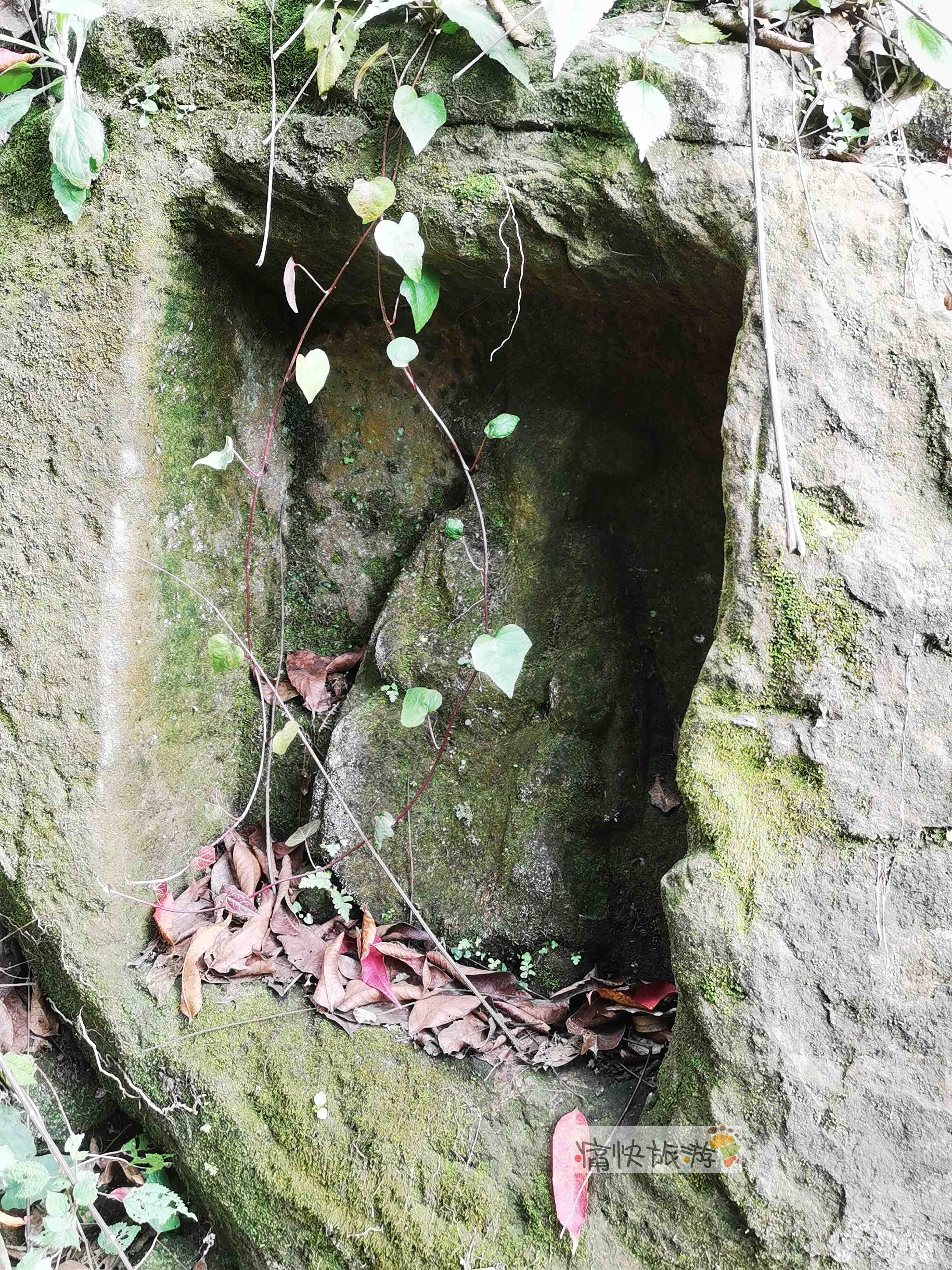 距离摩崖造像几米远的岩石下方有土地龛,其造像上已长满了苔藓植物。