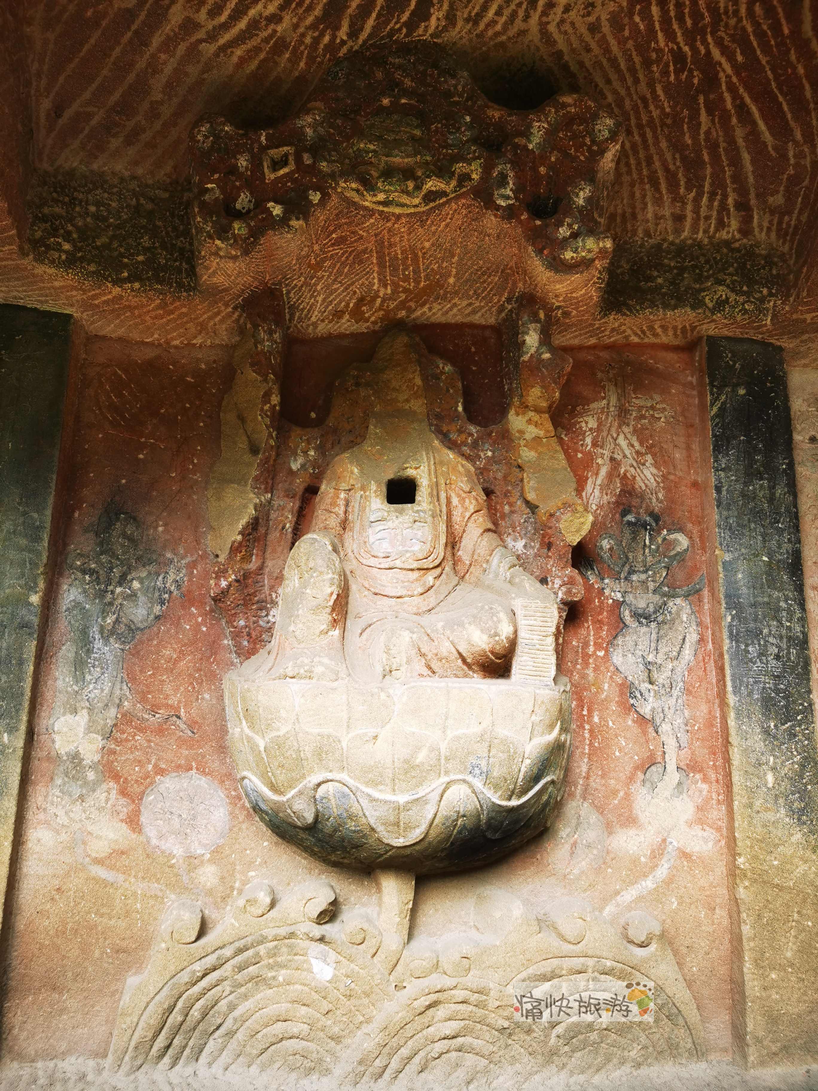 明间的观音造像除头部毁损外,基本较为完整。底部的波涛支撑其莲花座,观音整体雕刻简洁,胸口的方孔不知是不是后来开凿的,两侧依稀可见善财童子和龙女的彩绘图案。