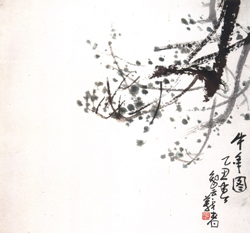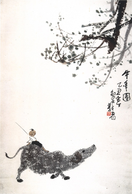 一个童子骑着老牛,穿越时空从远古踱步而来。老牛沉重的步履,一路踏过唐宋元明清,来至当代。右前方一丛苍老的梅树,新梅正含苞欲放,仿佛在恭迎着他们的到来。