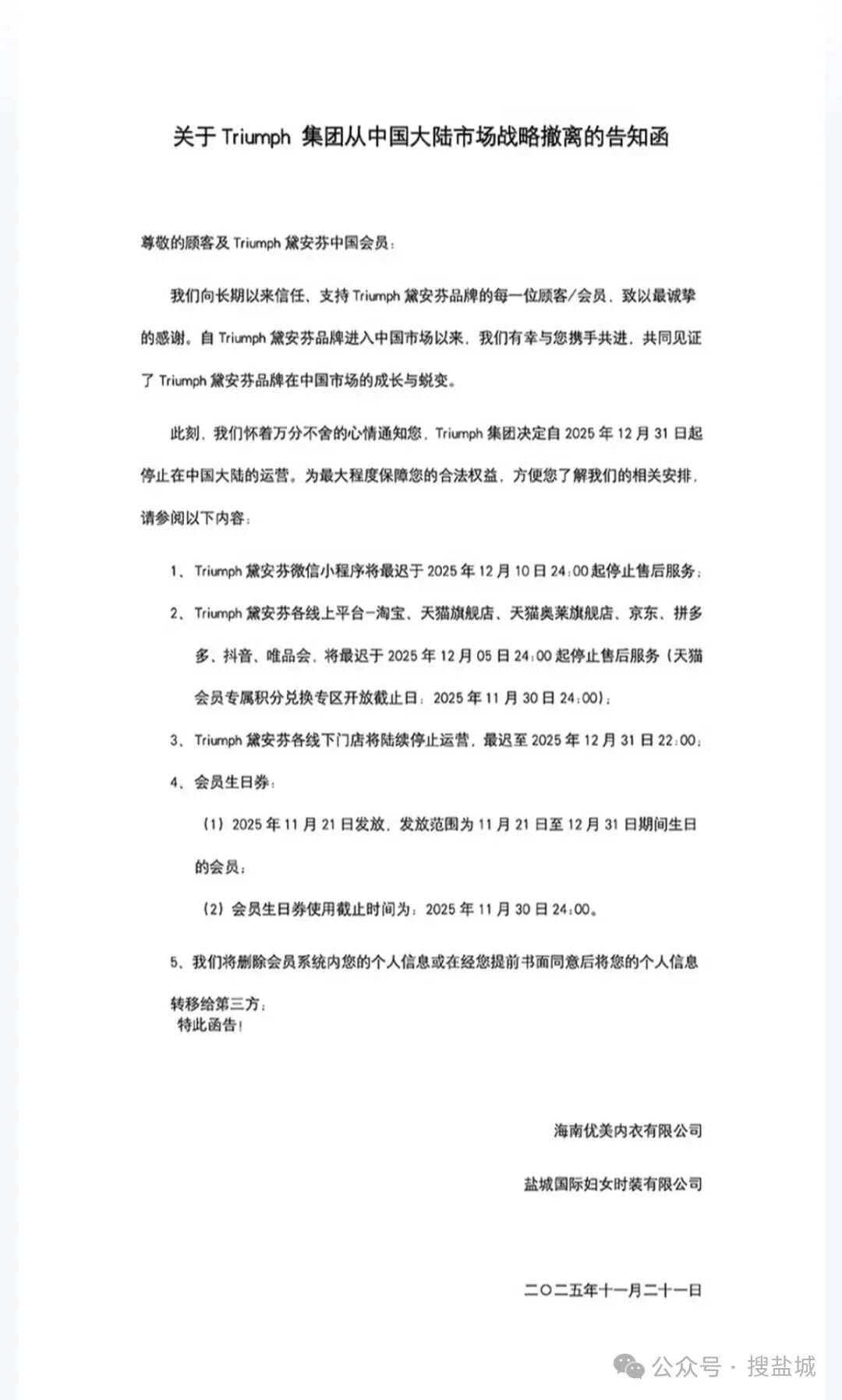 此刻,我们怀着万分不舍的心情向您通报一个重大决定:Triumph集团经过慎重的战略考量,决定自2025年12月31日起停止品牌在中国大陆的运营。这一决定标志着Triumph黛安芬这一内衣行业的重要品牌,将暂别中国大陆市场。