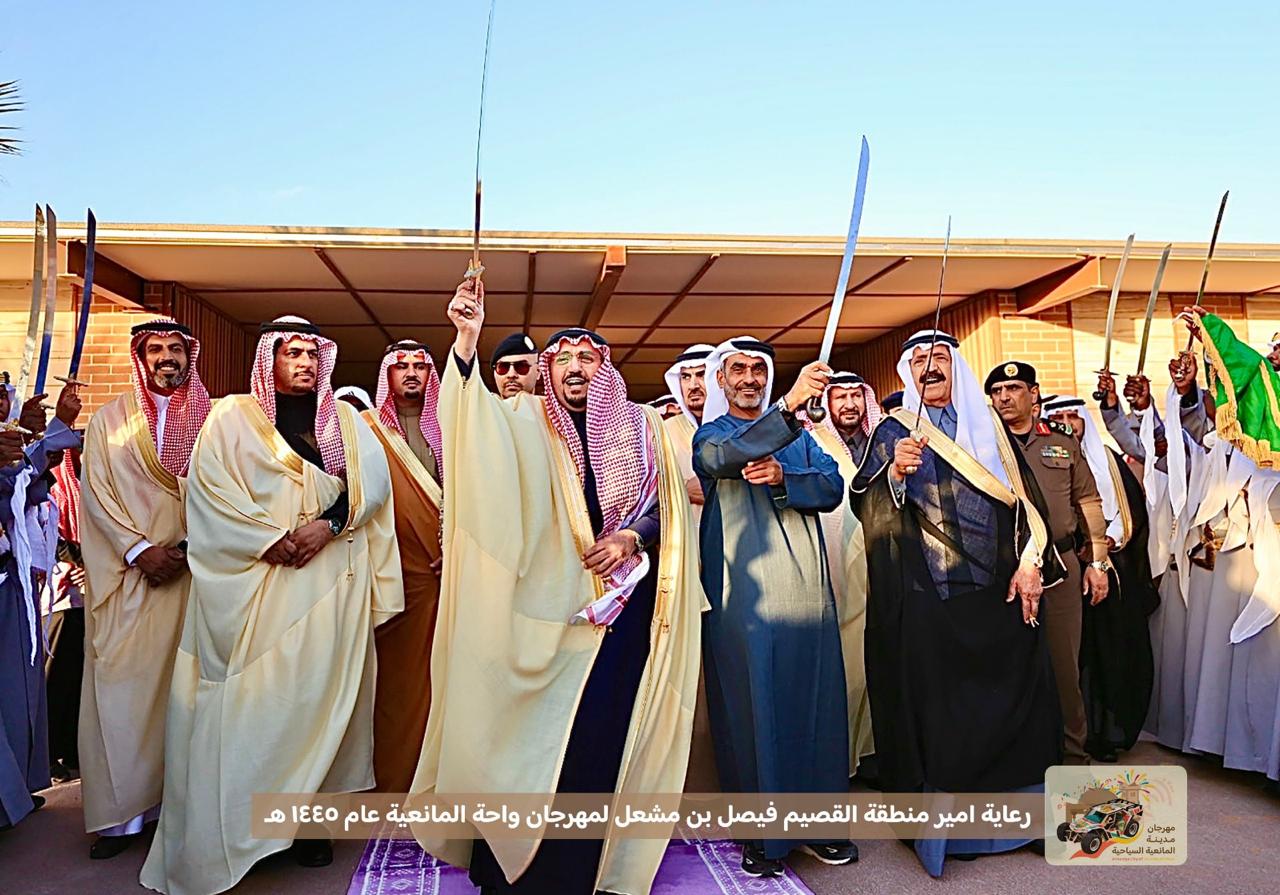 阿尔米赫纳布省总督费萨尔·本·米沙勒·本·沙特·本·阿卜杜勒阿齐兹·阿勒沙特亲王(Prince Faisal bin Mishaal bin Saud bin Abdulaziz Al Saud)(前排中)与沙特绿洲节创始人兼主席、阿联酋拉希德·阿尔·加布里集团主席拉希德·阿尔·加布里(Rashed Matar Rashed Al Jabri, Al Jabri Group)(前排右二)在绿洲节开幕式上剪彩