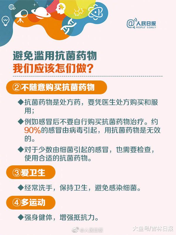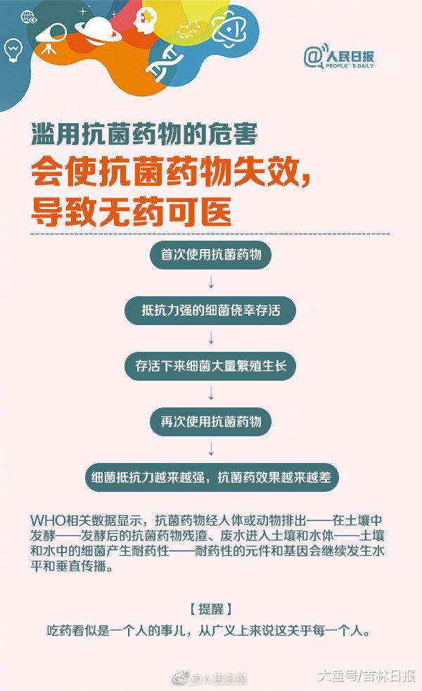【拒绝滥用抗菌药:九成感冒不需要吃抗菌药】 头疼脑热、嗓子发炎、感冒发烧,很多人就想吃点抗生素来“杀杀菌”“顶回去”。#抗菌药不是万能药#!滥用抗菌药导致的细菌耐药性,已成为全球公共健康领域的重大挑战。11月18日至24日,2019年提高抗菌药物认识周,戳图↓↓为了你和家人的健康,转发提醒!(人民日报)