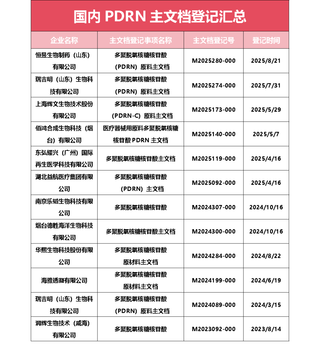 同时作为新型生物材料,PDRN需通过主文档备案制度向药监部门提交生产工艺、质量控制等核心数据,便于合规开展临床试验与产品注册流程。截至发稿,国内已有11家企业先后完成PDRN主文档备案。