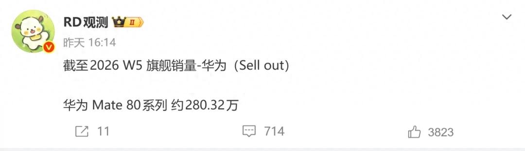 根据RD观测发布的数据,华为Mate80系列截至W5周的销量(激活量)为280.32万台,相比W4周的增量是26万台。