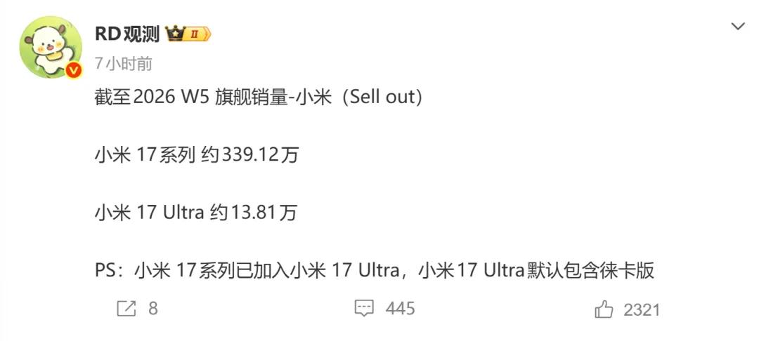 而小米17系列四款机器截止2026年W5周的销量(激活量是)339.12万台,相比W4周增量为10.4万,其中Ultra版卖了0.75万台。