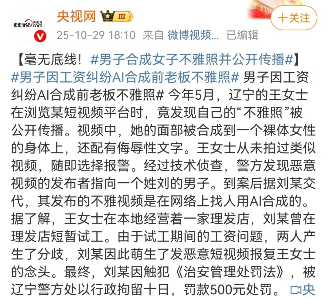 据@央视网10月29日报道,近日辽宁沈阳警方公布了一起利用AI技术合成他人不雅视频并恶意传播的案件。