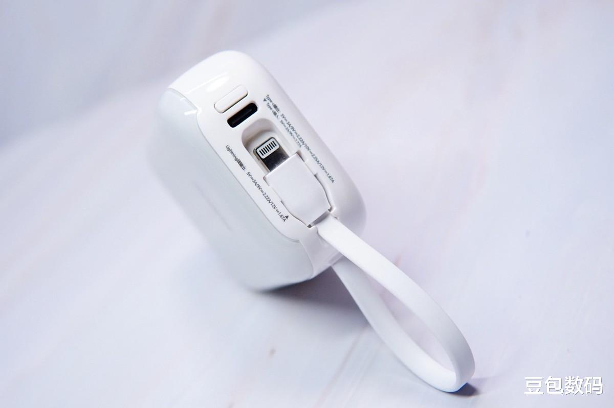 充电宝自带了两根不同接口的充电线,一条为苹果的Lighting充电线,另一条是type-c充电线,这样无论是苹果又或是其他type-c接口的设备都可以便捷的进行充电。出门再也不用担心只带充电宝忘记带线的尴尬情况出现了,而且上面的长线还可以当作挂绳,把充电宝挂在包上,随用随取非常方便。