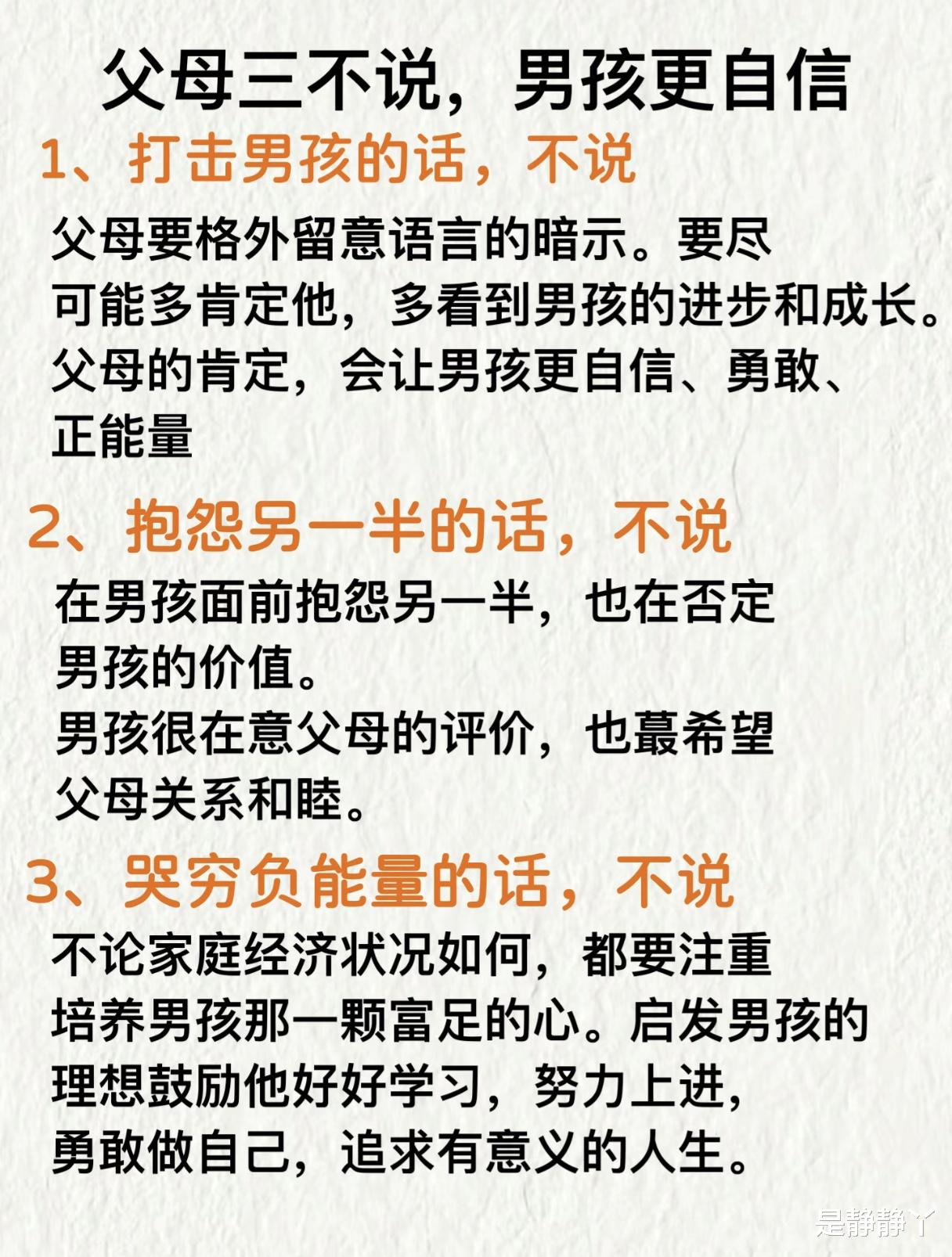 养育男孩时,我们需注意语言的力量,因为一言一行都会影响他们的性格和价值观。一次,我与丈夫因小事争吵,孩子躲在房间哭泣,他问:“妈妈,你们是不是不爱我了?”这让我感到愧疚,意识到在孩子面前抱怨另一半是在否定他的价值。男孩在意父母的关系,渴望家庭和谐。因此,我们避免在孩子面前争吵,不抱怨另一半,有矛盾私下解决,并展现父母恩爱的样子。我们还会经常肯定和鼓励他,让他感受到爱和支持。无论经济状况如何,我们都会培养他富足的心态,鼓励他追求有意义的人生。