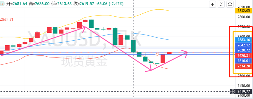 从整体结构上来看:黄金今天还是偏震荡多头一些,黄金现价2618上下,如下探