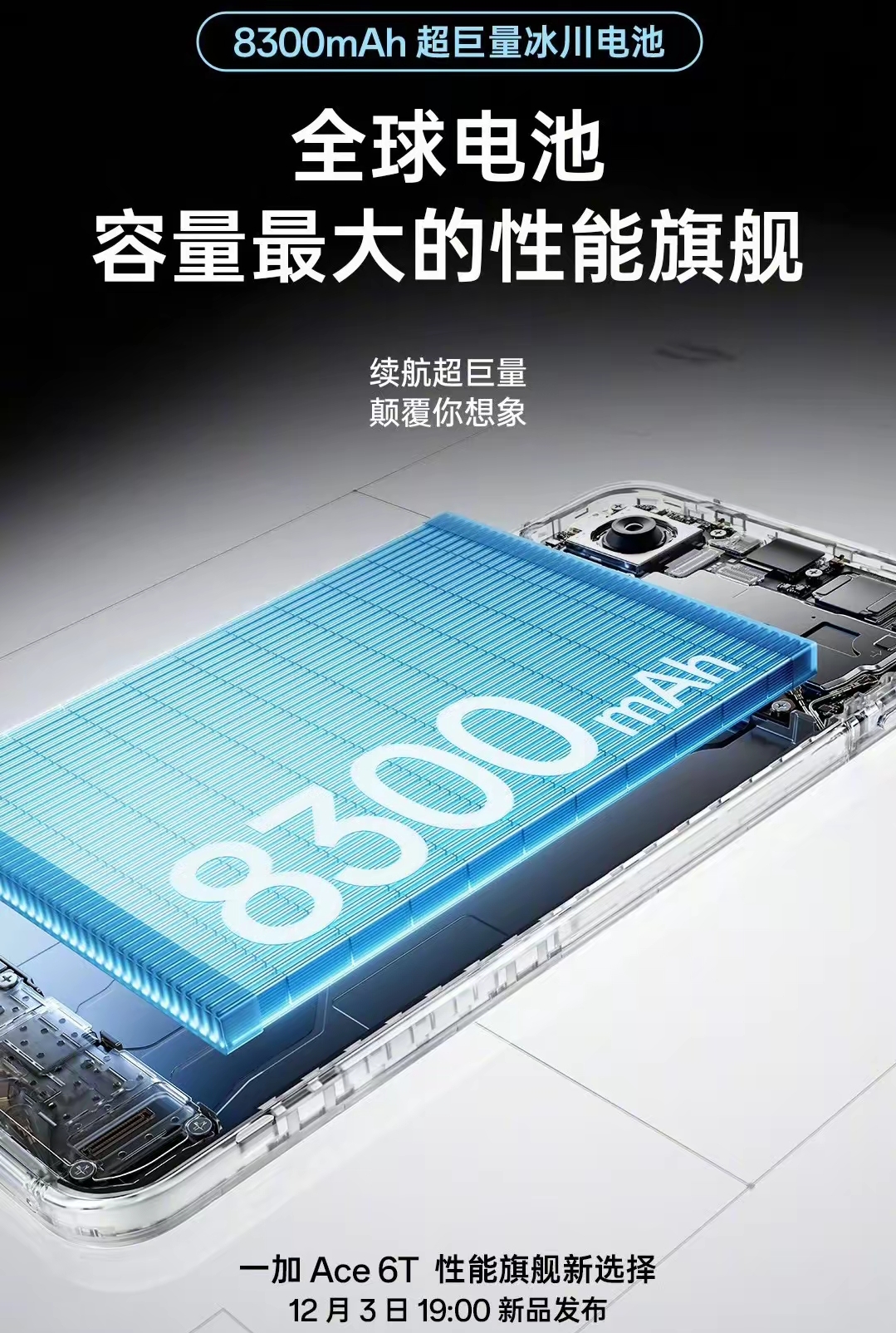 续航方面,一加Ace6T首发搭载8300mAH冰川大电池,这也是继8000mAH的iQOOZ10Turbo+后,第二款电池容量高达8K级别,同时又拥有高性能表现的手机了,这次电池容量比iQOO还大了,加上更高能效的芯片,一加Ace6T续航十分出色,重度用户甚至也能轻松用一天了,充电速度也不慢,给到了100W高功率闪充,同时也会配备旁路供电技术——游戏时充电电流直供主板,既减少电池损耗又降低机身发热,延长电池寿命。