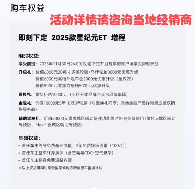 而在当下11月份的购车政策中,星纪元ET这款车给到了1万元置换补贴,5年10万贷款前3年免息等购车权益(活动详情可咨询当地经销商)。整体来说目前该车的购车权益表现还不错,也一定程度上降低了该车的购车门槛,整体来说该车还是主要以20万元的价格区间为主, 以满足改善用车需求但是并不会花费较多,从而吸引这一购车预算的消费者。