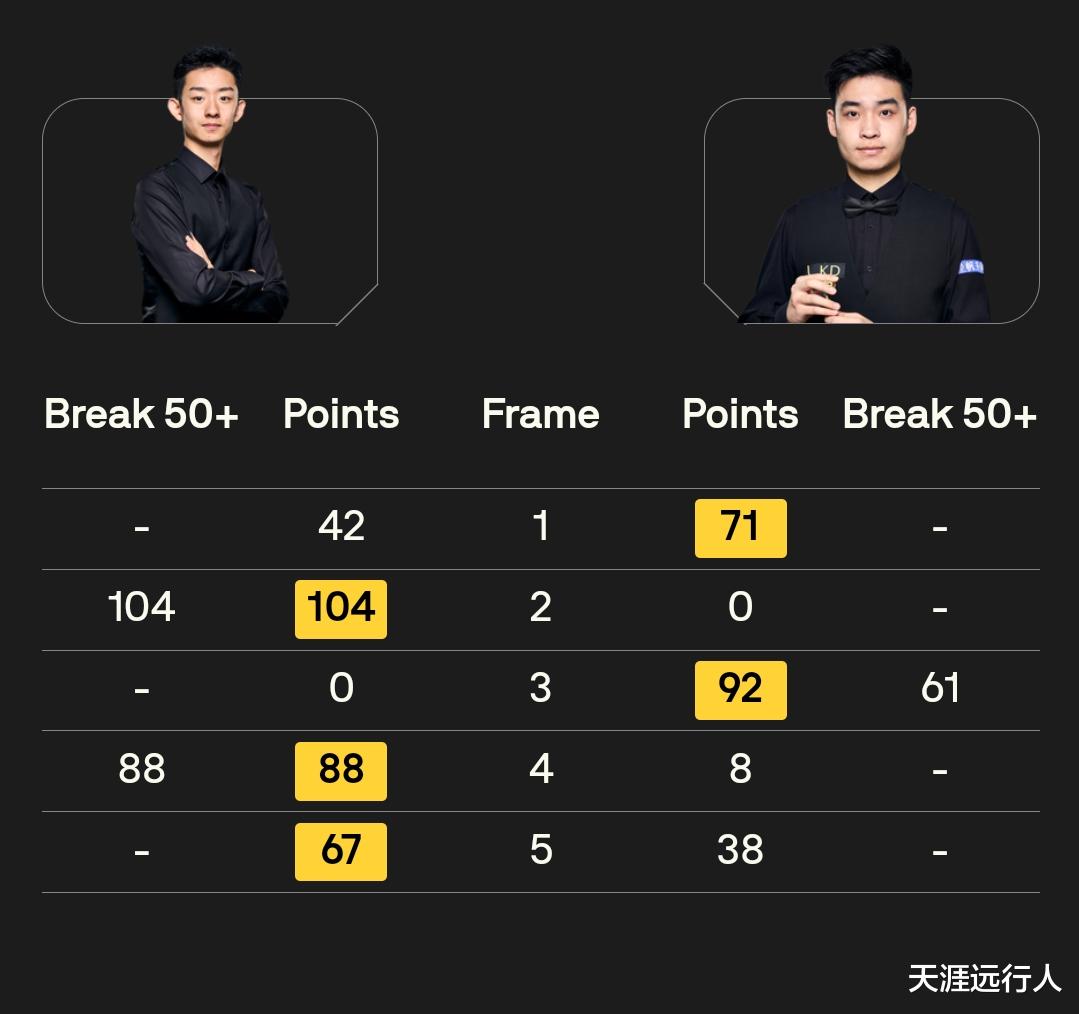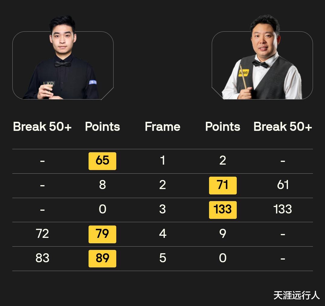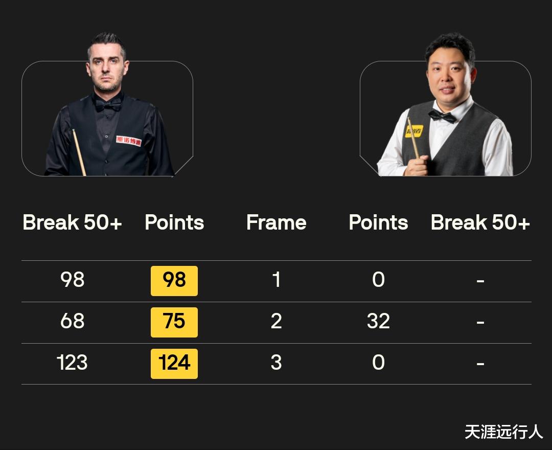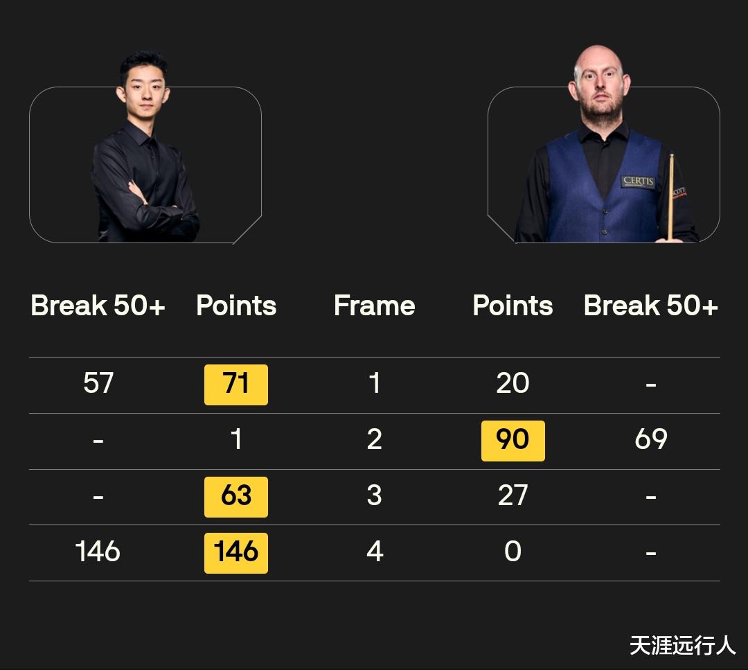 这个比赛日共打出11杆破百,打到最后的马克·塞尔比跟吴宜泽各打出四杆,三战三负、小组垫底的张安达也打了两杆;吴宜泽对阵塞尔特轰出的单杆146,带走1000英镑、本届冠军联赛最贵的一杆单杆最高分奖金,直接是他在第六组跟赵心童、肖国栋一起打出的三杆147满分杆奖金的整整六倍。