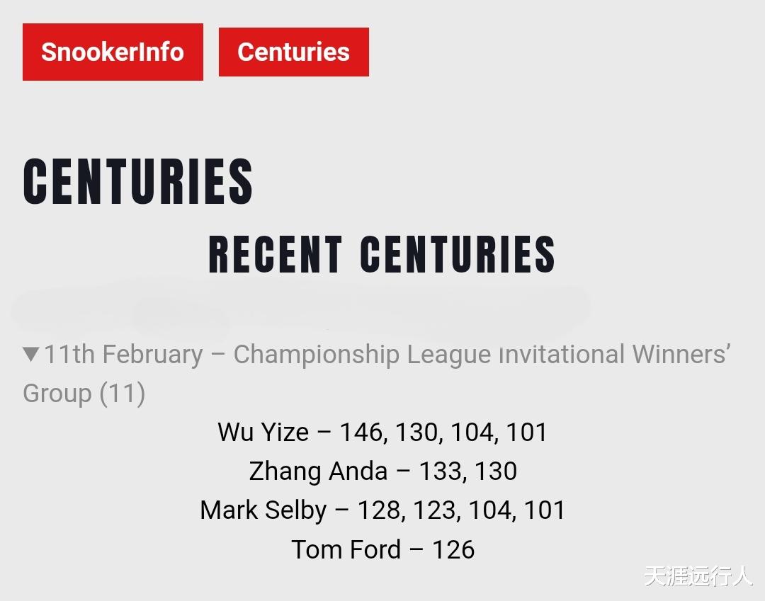 这一届冠军联赛邀请赛版七个组以及最后胜者组的全部赛事战罢,马克·塞尔比卷走冠军,拿了21000英镑最多的奖金,14杆破百也跟吴宜泽以及上赛季创造斯诺克历史的单届赛事破百王奥康纳,一起并列破百杆数第一。
