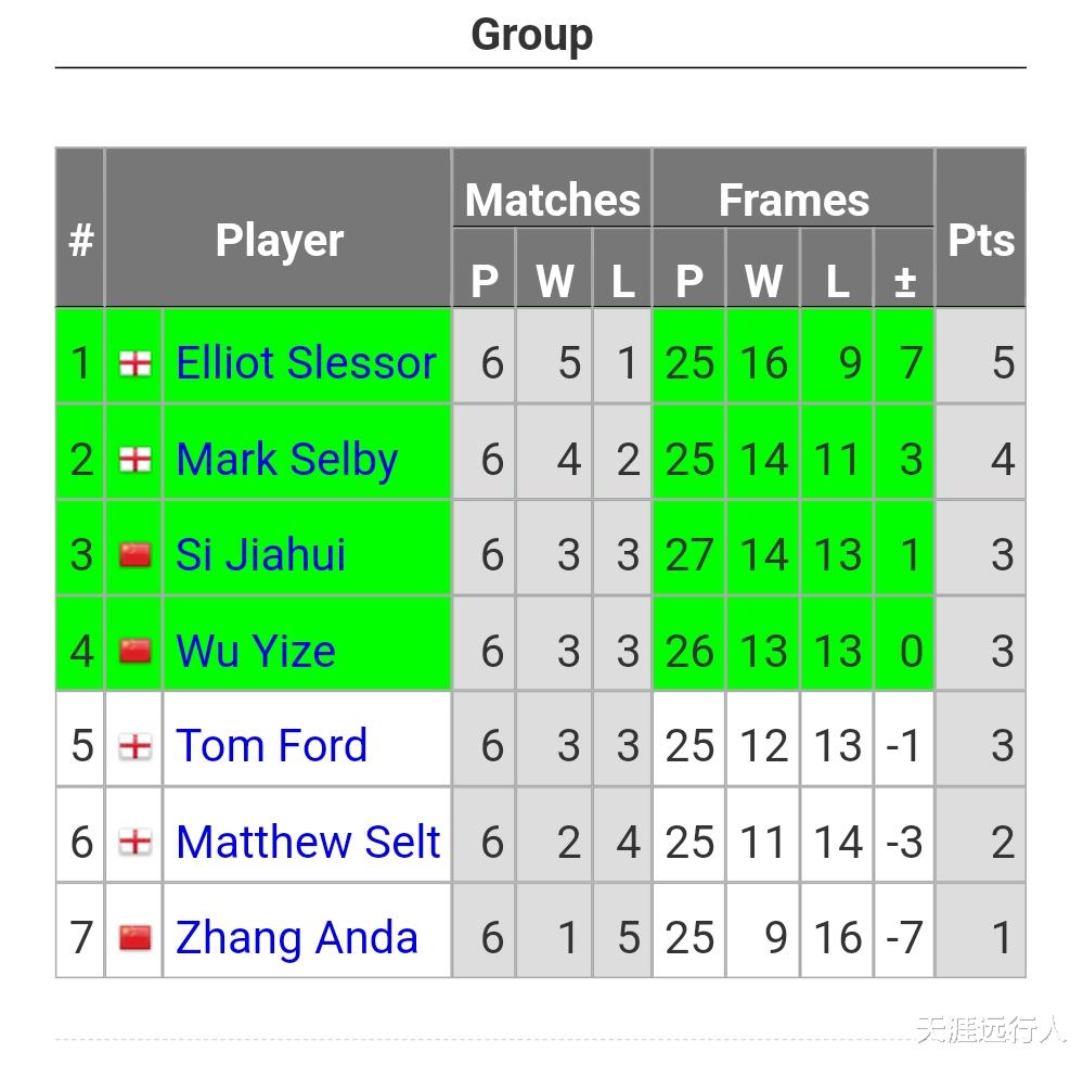 吴宜泽、斯佳辉都打出两胜一负,跟塞尔比、斯莱塞一起跻身小组淘汰赛阶段。
