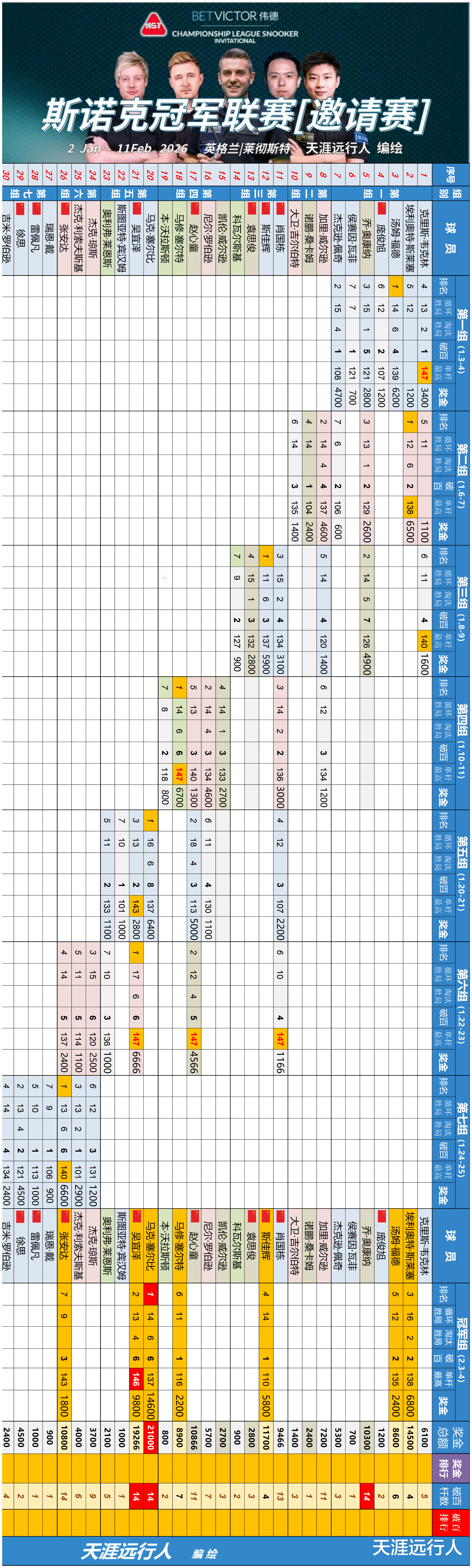 北京时间2月12日凌晨4时31分,2026斯诺克冠军联赛邀请赛版胜者组收官日的赛程全部结束。