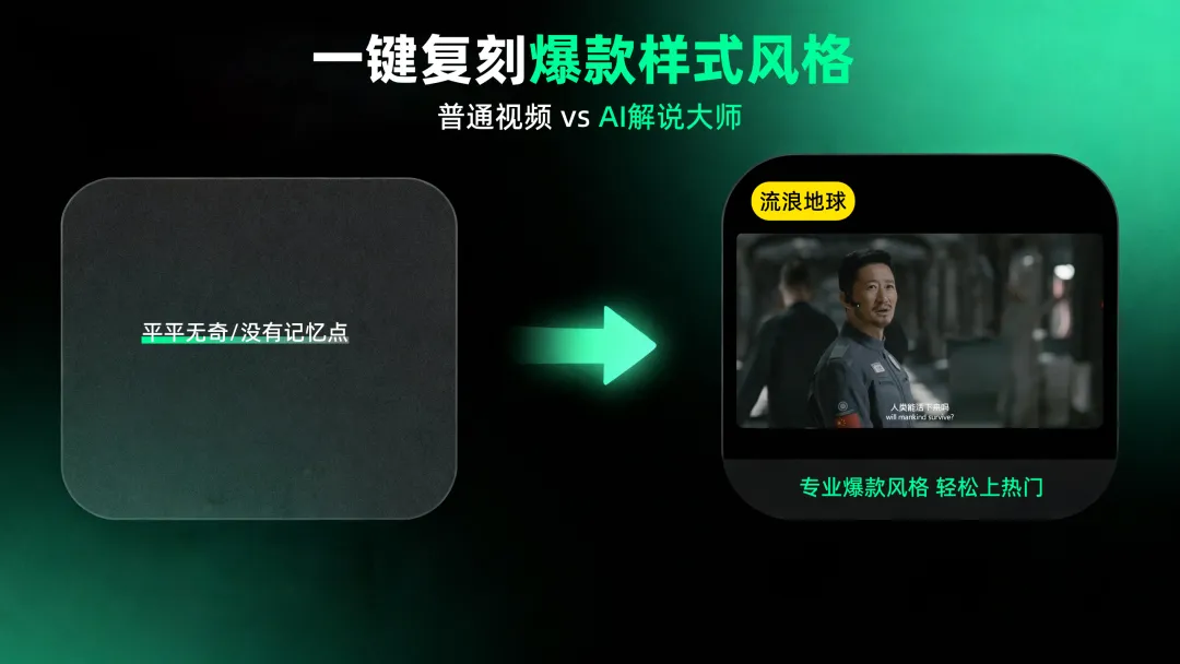 过去,AI解说大师帮你解决了复刻爆款内核的问题;今天我们帮你补齐最后一块短板:复刻爆款视频的外在表现形式。让解说视频内容与外观,一起进化。