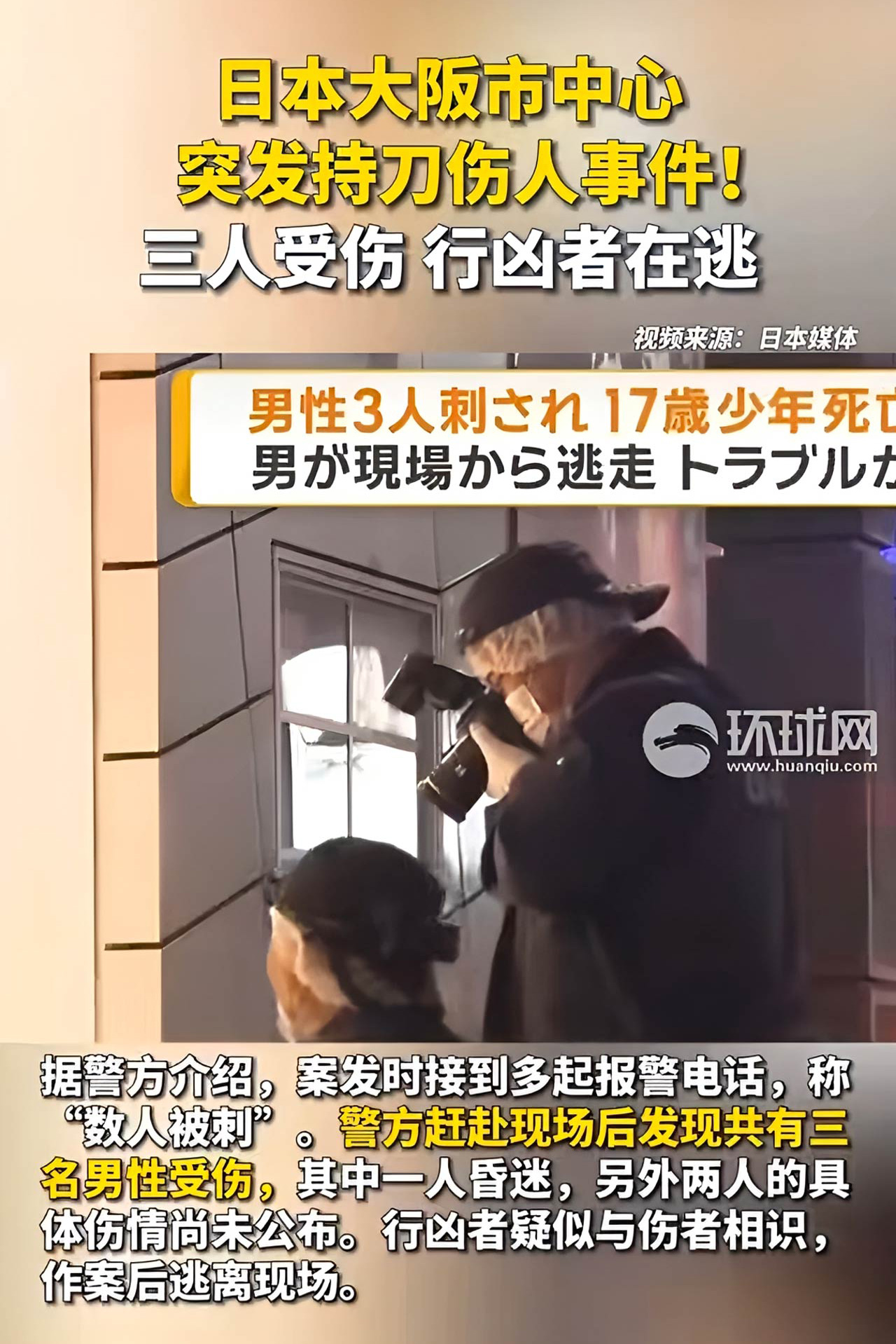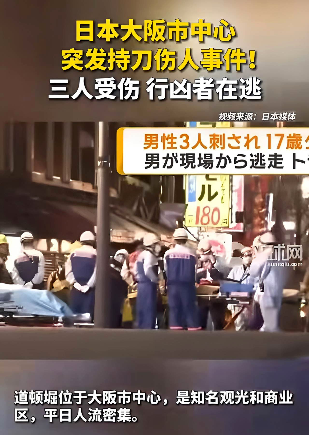 当地时间2月15日零时许,日本大阪市中央区道顿堀商圈发生持刀伤人事件,造成3名男性受伤,其中1人伤势危重,行凶者作案后逃离现场,警方正全力追捕。