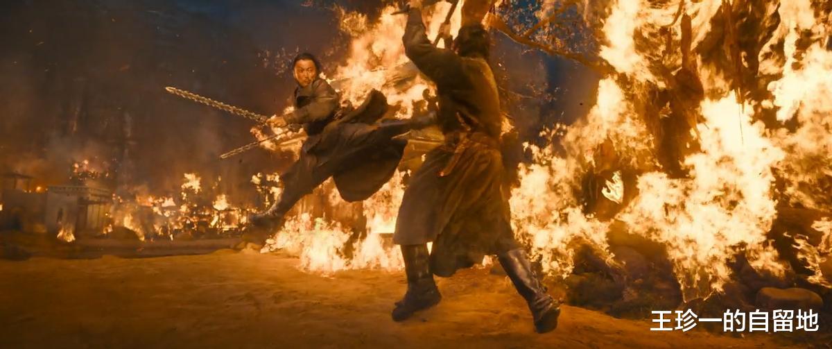 这些动作,都是剧组用真实的自然环境去还原的。一方面,顺风逆风,其实代表着两个人的立场和价值观。另一方面,风中的动作戏更考验导演和演员的功力,这场大漠风沙里的决斗,是全片最燃,最好看的段落之一。