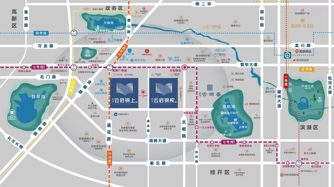 在交通方面,项目堪称“立体交通枢纽”。繁华大道、锦绣大道、金寨路等城市主干道环绕四周,日常自驾出行畅通无阻;地铁7号线(在建中)明珠广场站、天都路站临近项目,未来通车后可快速通达全城;再加上规划中的地铁9号线,双地铁加持让公共交通出行更加便捷。无论是通勤上班,还是周末出游,多维交通网络都能轻松满足需求,真正实现“全城便捷通行”。