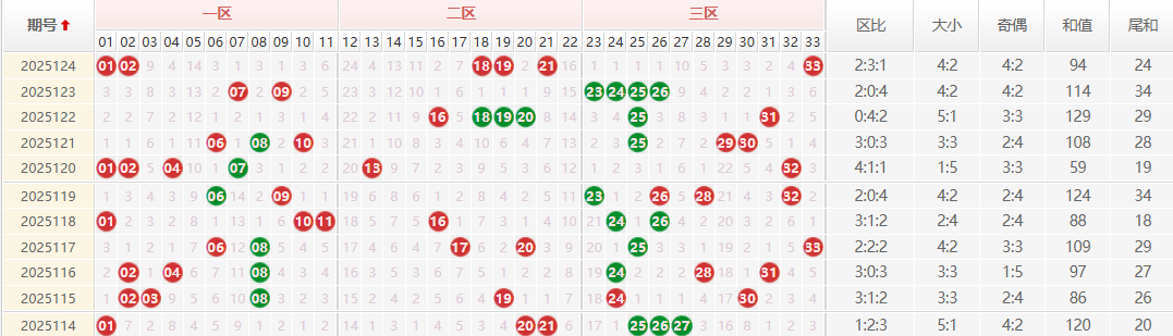 区间分布:124 期 23-33 区间仅 1 枚号码,结合 “区间交替补位” 规律,125 期该区间号码大概率增至 2-3 枚,12-22 区间或缩减至 2 枚,形成更均衡的区间分布。