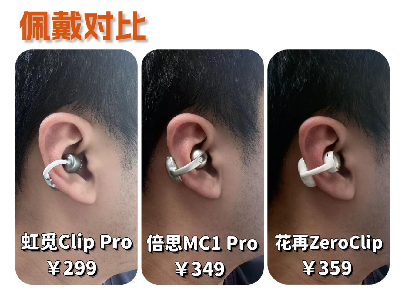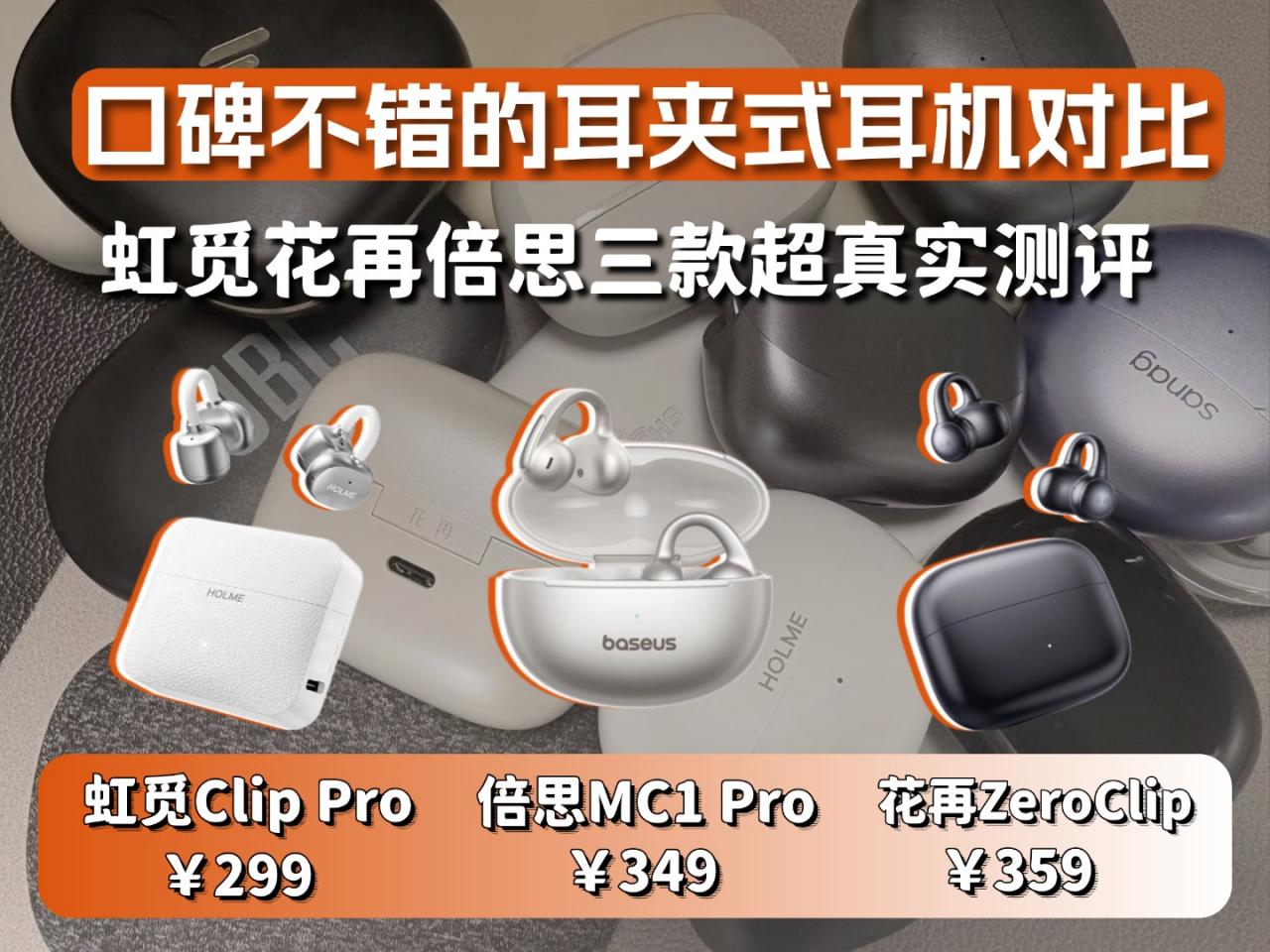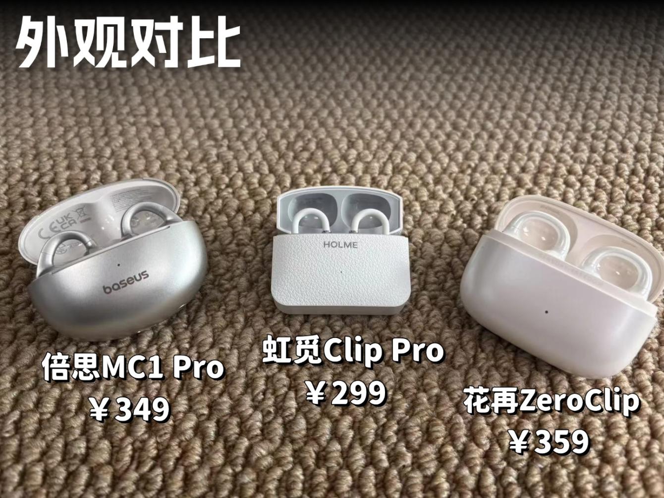 这次我挑了三款市面上火热度高、定价亲民的耳夹式耳机,分别是虹觅Clip Pro、倍思 MC1 Pro和花再ZeroClip,三款价格从一百多到三百多不等,各有各的设计和功能亮点,接下来就从实际使用的角度,聊聊这几款耳机的真实体验,帮大家挑的时候少走点弯路,避开那些实际体验拉胯的坑。