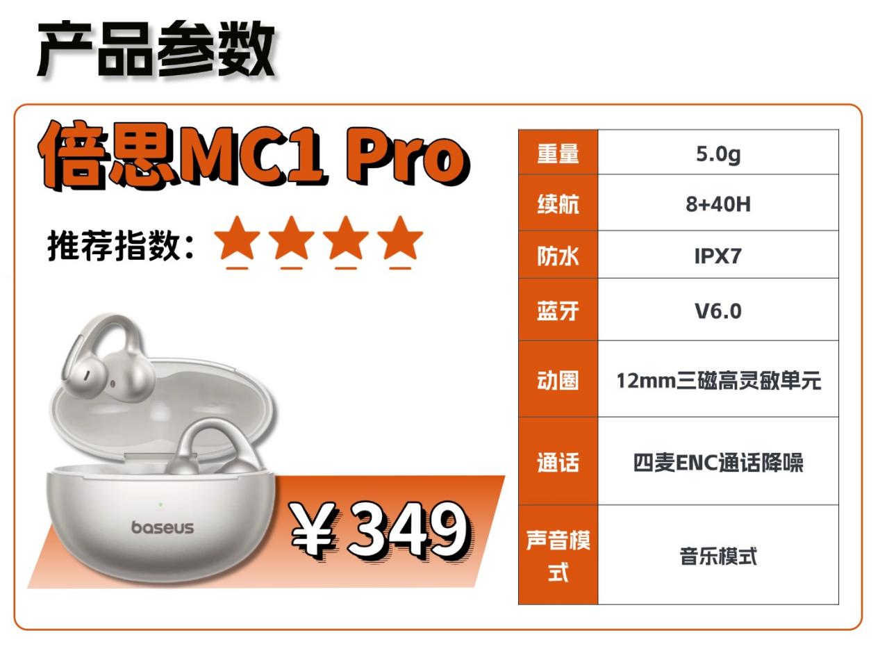 如果是户外运动爱好者,注重防水性能和佩戴稳定性,倍思 MC1 Pro值得入手。349 元的价格配备 IPX7 顶级防水,还有云朵气囊 Pro 舒适佩戴设计和 360° 全景环绕声场,户外使用防水抗汗、佩戴稳固,听音体验也不打折扣。