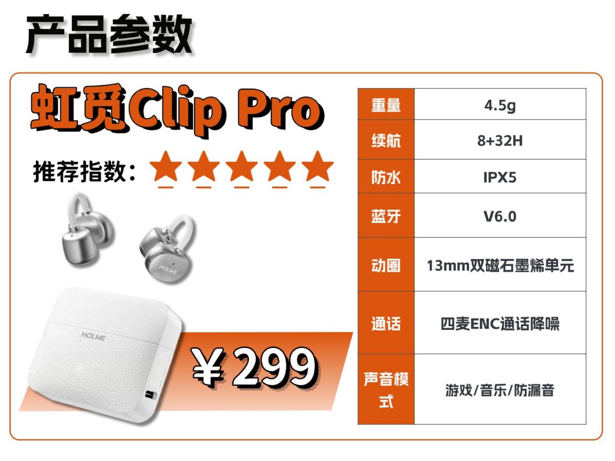 总结如果追求高性价比,且有办公等安静场景的听音需求,虹觅 Clip Pro是首选。299 元的价格能拥有专属防漏音模式、13mm 高配石墨烯动圈单元和轻量化佩戴体验,同价位中综合表现突出,日常听音、办公的核心需求都能满足。