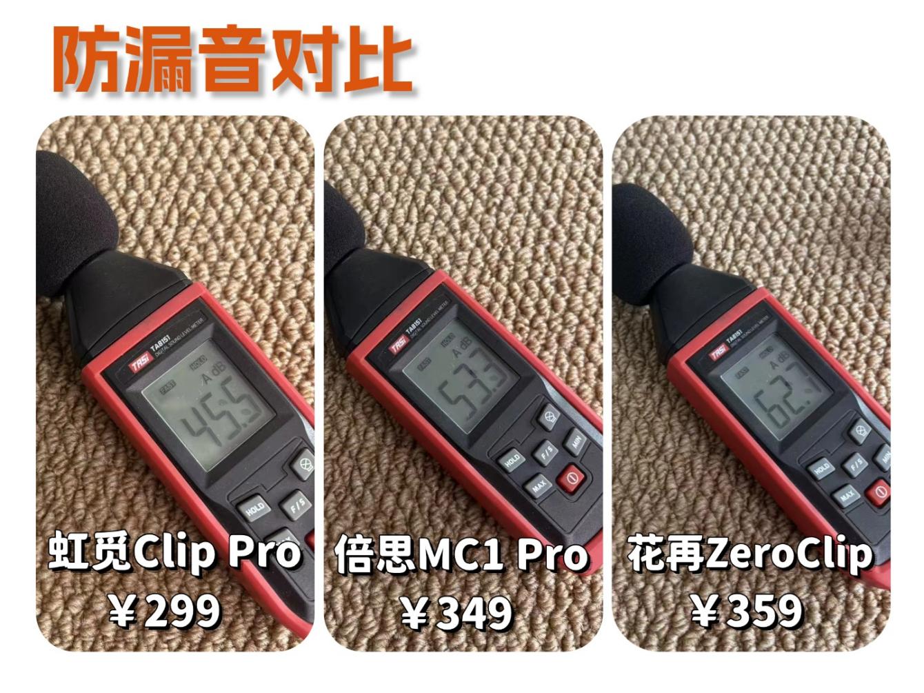 倍思 MC1 Pro 和花再 ZeroClip仅做了基础的防漏音处理,其中倍思 MC1 Pro 的基础防漏音效果尚可,在安静环境下基本听不到漏音;花再 ZeroClip 在安静场景中使用时,会有轻微的漏音情况,将音量适当调小后,漏音问题能得到明显改善。