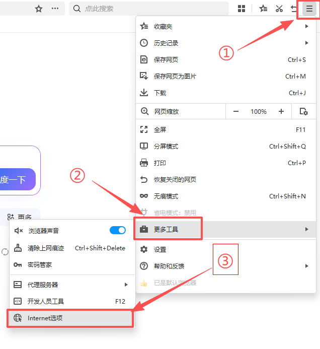 双击打开浏览器 → 点击右上角的菜单图标(通常是三个点或三条横线) → 选择「更多工具」→ 打开「Internet选项」。