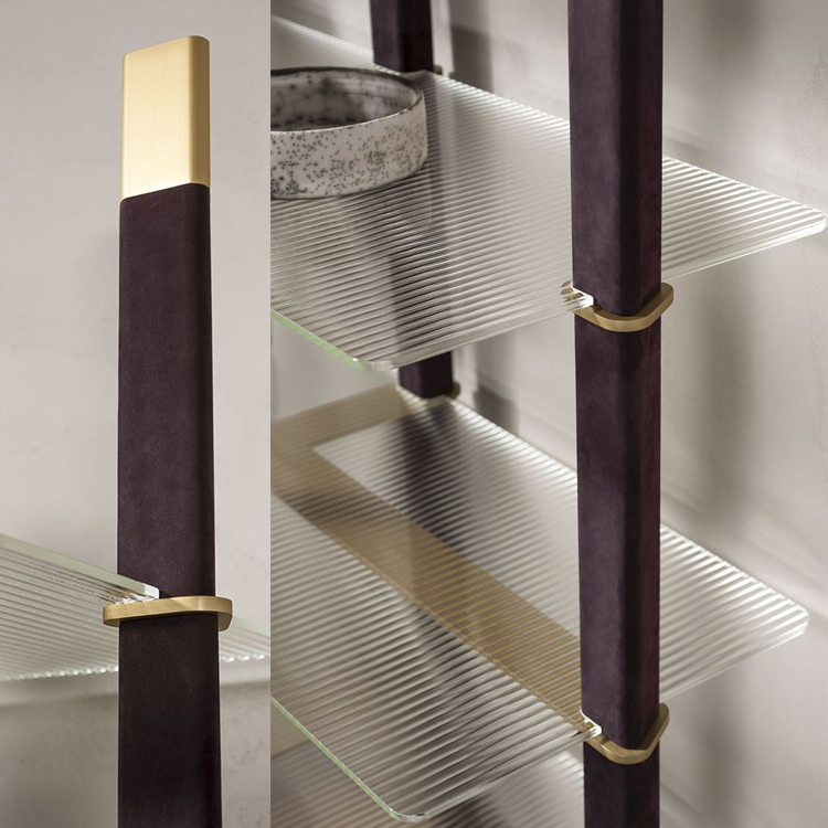 Mikado是一个独立的书架,由皮革覆盖的支架,金色细节增加了它的精致感,浅色条纹玻璃格外清晰。