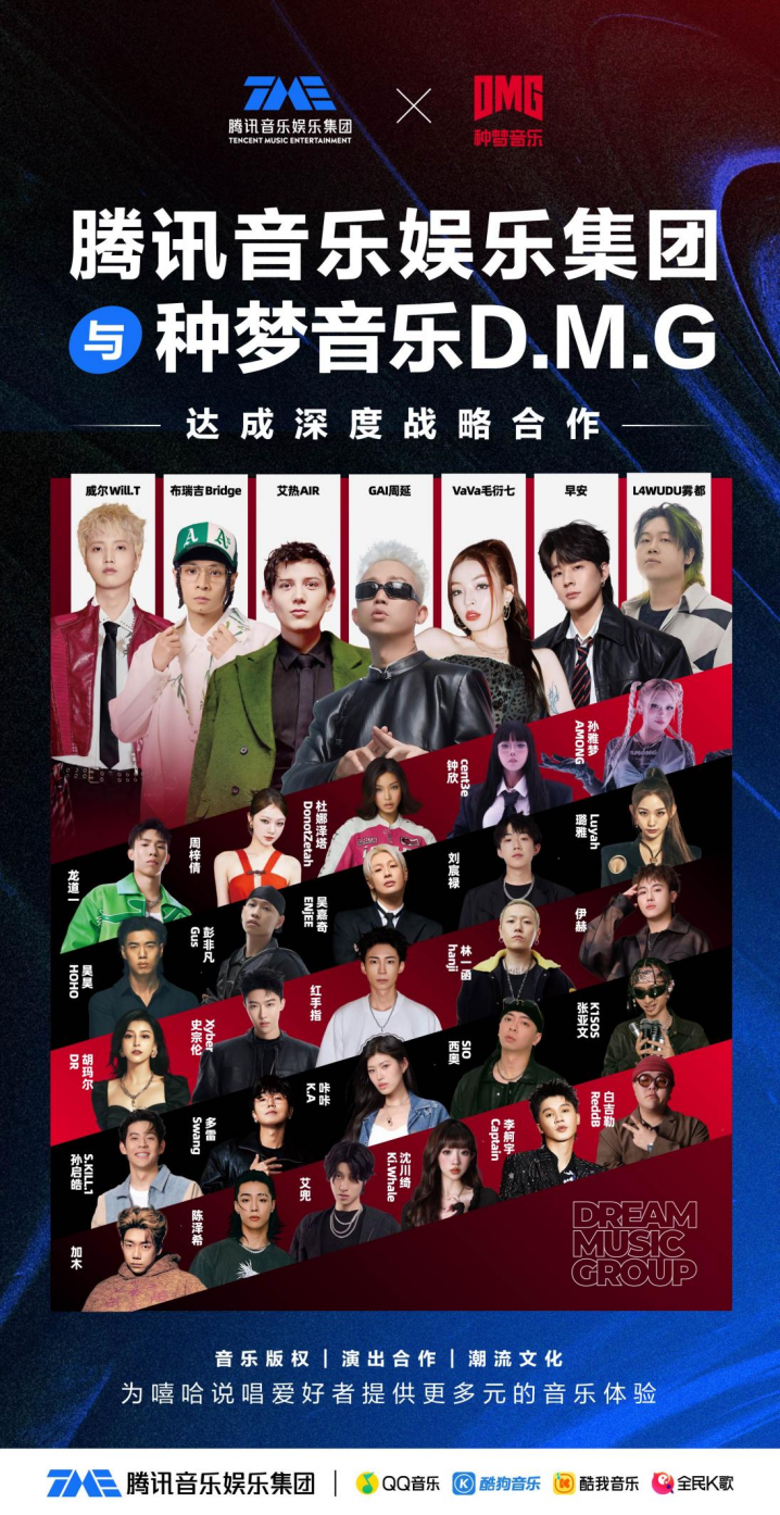 不久前,腾讯音乐娱乐集团宣布与种梦音乐D.M.G成深度战略合作。双方将在音乐版权、音乐演出、潜力说唱音乐人挖掘与扶持、品牌联动与跨界合作等多个领域展开深层次合作,携手推动国内说唱音乐生态的繁荣发展。种梦音乐旗下艺人丰富的正版音乐作品将全面上线TME旗下QQ音乐、酷狗音乐、酷我音乐等平台。TME与种梦音乐还将帮助音乐人创造更多高品质说唱音乐内容,为优秀说唱歌手创造更多展示才华的舞台与演出机会,助力其实现音乐梦想与职业价值,也为中文说唱爱好者们带来更丰富立体的视听盛宴。未来,双方也将持续推动中外说唱歌手的合作,促进跨文化交流,助力中文说唱在全球范围的影响力提升。