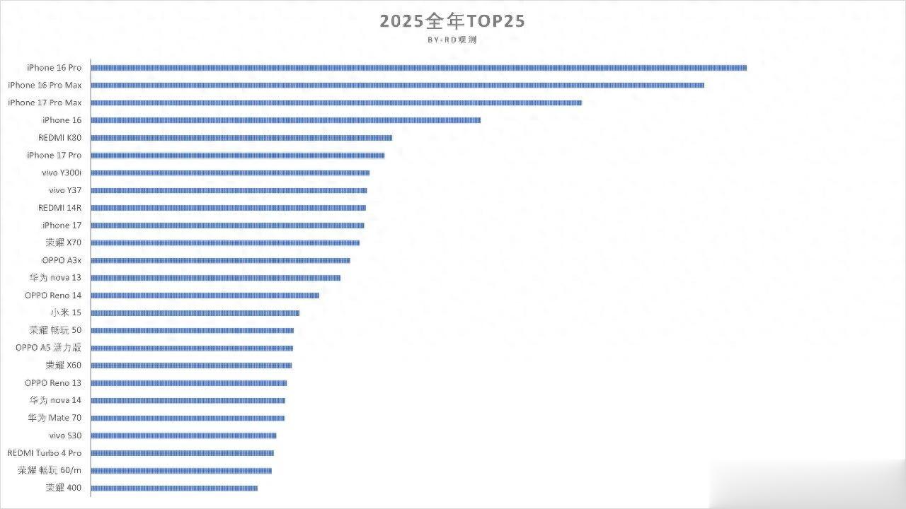 2025国内手机市场全年TOP25榜单一出来,感觉气氛瞬间安静了,本以为国产高端旗舰会大量出现在榜单中,结果从第1名到第4名都是iPhone,而且整个榜单中出现了6款iPhone,国产高端里面只有小米15和华为Mate 70上榜,算是为国产品牌保住了点面子。