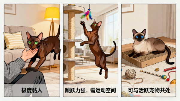 对城市环境适应度极高,既能在公寓中活跃生活,也能适应庭院空间。性格较暹罗猫更温顺,对儿童和陌生人态度友善,但对突发噪音较敏感。