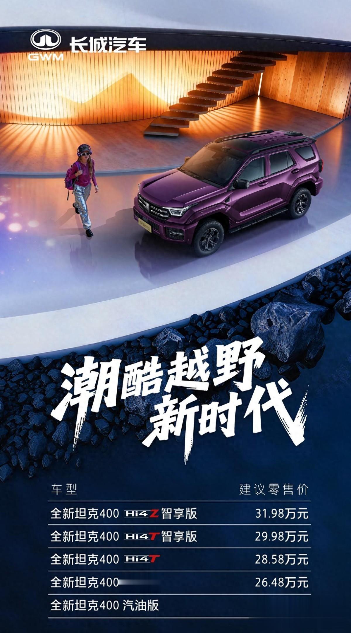 全新坦克400 Hi4-Z智享版,售价31.98万元;全新坦克400 Hi4-T智享版,售价29.98万元;全新坦克400 Hi4-T,售价28.58万元;全新坦克400 柴油版,售价26.48万元;全新坦克400 汽油版,售价24.98万元。即刻下单可享多重尊崇权益,坦克以满满诚意为年轻用户体验潮酷越野带来惊喜购车优惠。