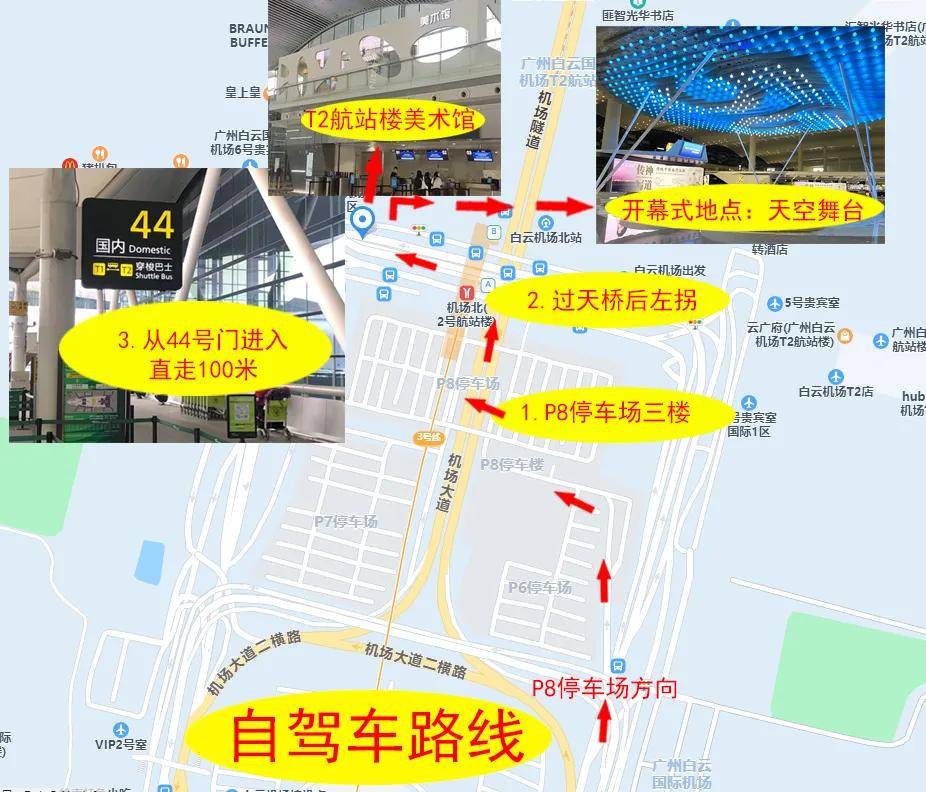 1.自驾出行:导航“广州白云国际机场P8停车场”,坐电梯至四楼天台穿过连廊通道至T2出发厅44-45号门进入“天空舞台”开幕仪式现场。