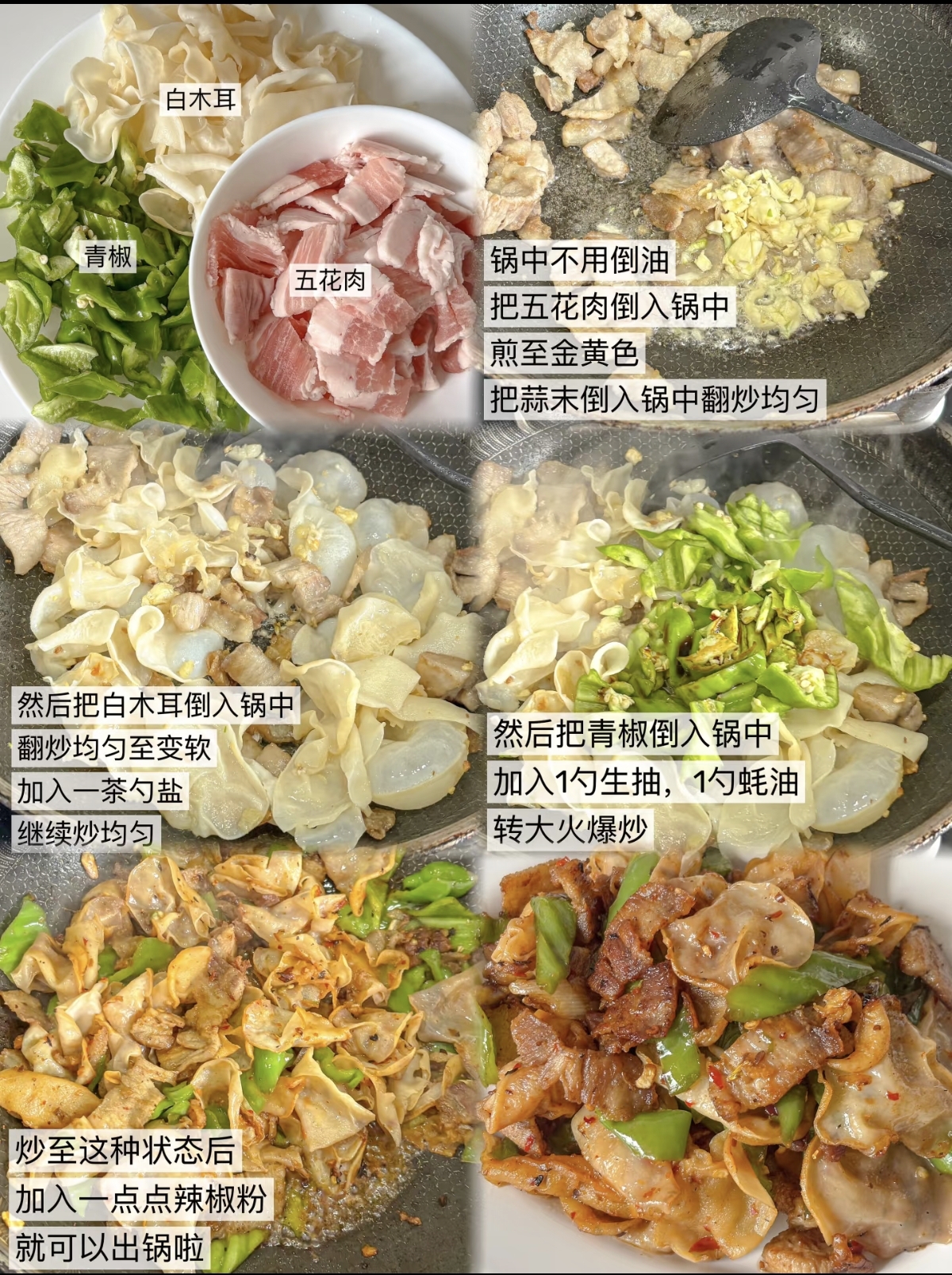 此时,将泡发好的白木耳倒入锅中,与青椒、肉片一同翻炒均匀。白木耳的加入,是这道菜的点睛之笔,它不仅口感爽脆,还带着一丝丝清甜,能很好地中和肉的油腻。翻炒片刻后,就可以开始调味了。根据个人口味,加入适量的盐、生抽、蚝油,喜欢辣一点的朋友,还可以撒上一点辣椒粉,继续大火快速翻炒,让每一朵白木耳、每一片青椒、每一块肉都均匀地裹上酱汁。