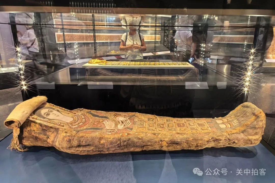 在后方昏暗的展室内,有一件罗马时期的女性木乃伊,表面包裹着镀金的石膏,浮雕的双手放置于腹部。头部覆盖的木板上,描绘出女子的面容,佩戴着耳环和项链,彩绘的衣服镶嵌着珠宝,显示出生前崇高的地位。