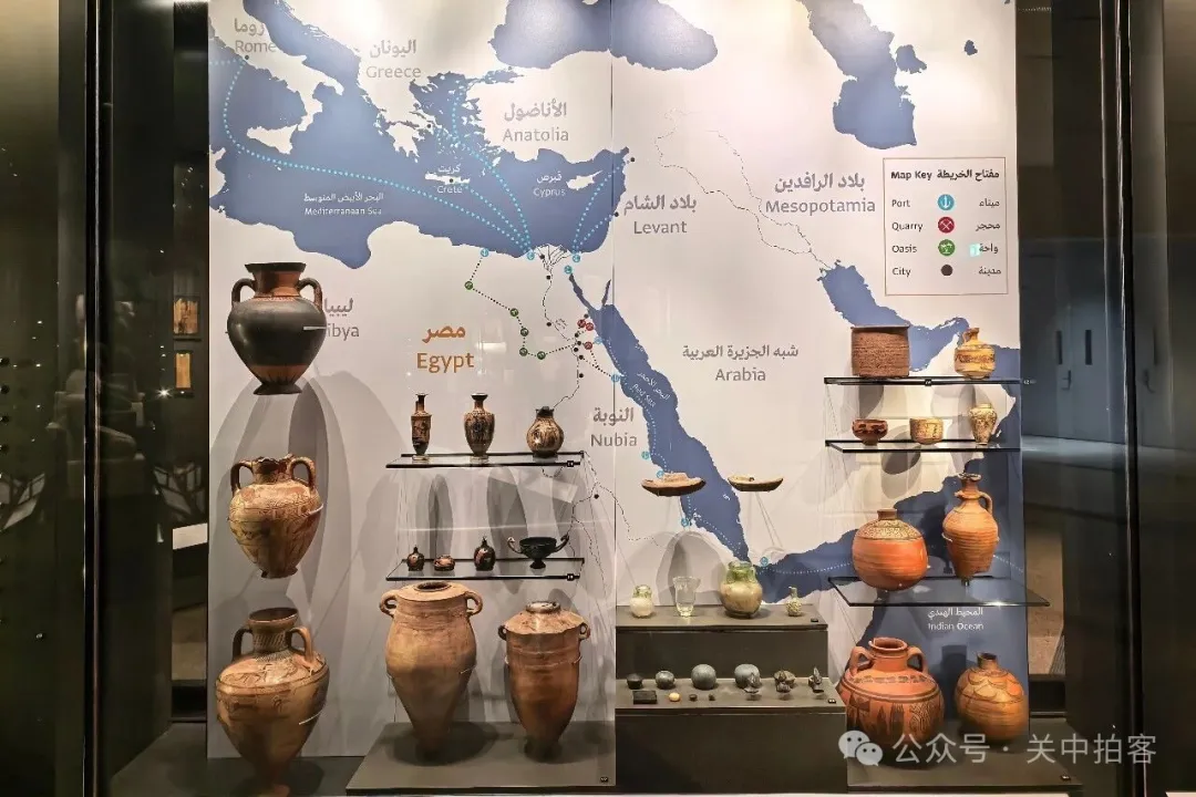 走进展厅,迎面是尼罗河示意图,标注着早期文明出现的位置,两侧陈列着不同遗址的代表性文物。古埃及人居住于尼罗河的谷地、三角洲和沙漠绿洲,河水的定期泛滥,形成肥沃的黑土。