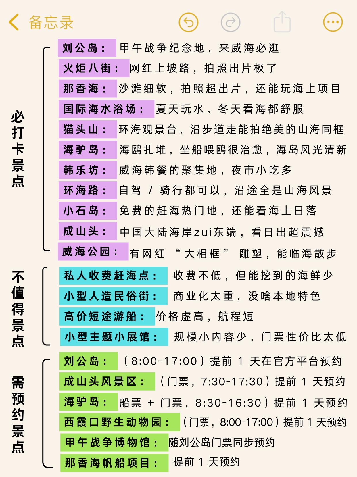 重点冲这些:刘公岛🇨🇳、火炬八街📸、猫头山🌊、小石岛赶海🦀、成山头看日出🌅。其他小众收费点可随缘,景点记得提前1天预约,避免跑空呀!