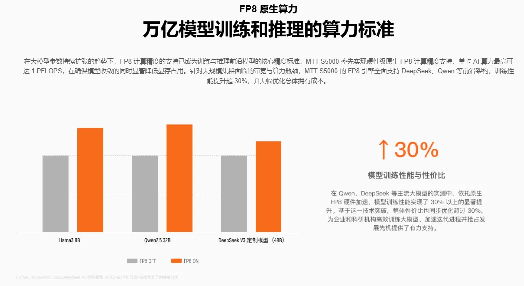 作为国内最早原生支持FP8精度的训练GPU,MTT S5000配置了硬件级FP8 Tensor Core加速单元,可以为DeepSeek、Qwen等前沿架构带来超过30%的训练性能提升。这不仅显著降低了训练成本与周期,也为AI研发实现更快速的迭代与优化提供了关键支持。