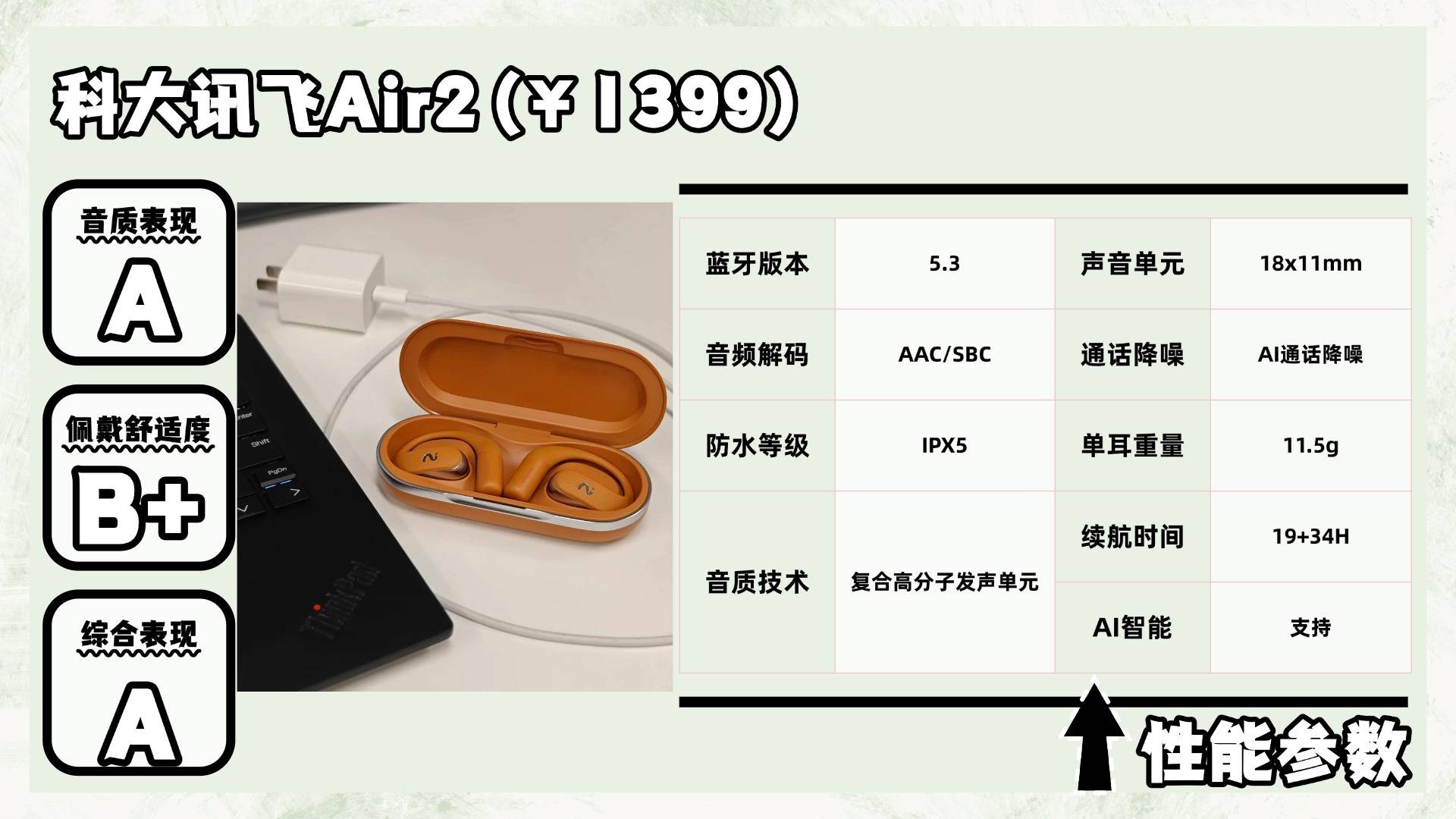 科大讯飞Air2采用挂耳式开放结构,单耳重9.8克,结合人体工学设计与亲肤硅胶材质,长时间佩戴无明显压迫感。即使在跑步等剧烈活动中,耳机依然稳固不易滑落。开放式听音设计让用户能够感知周围环境声音,提升了户外运动的安全性。但受物理隔音限制,该耳机更适合运动场景使用。