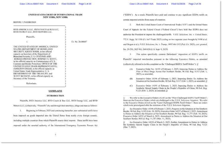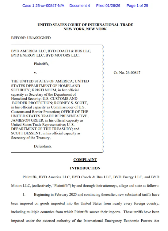 据多家媒体报道,美国国际贸易法院披露信息显示,比亚迪旗下四家美国关联公司已于1月26日正式向该院提起诉讼,直面挑战美国政府2025年落地的一系列汽车关税行政令。