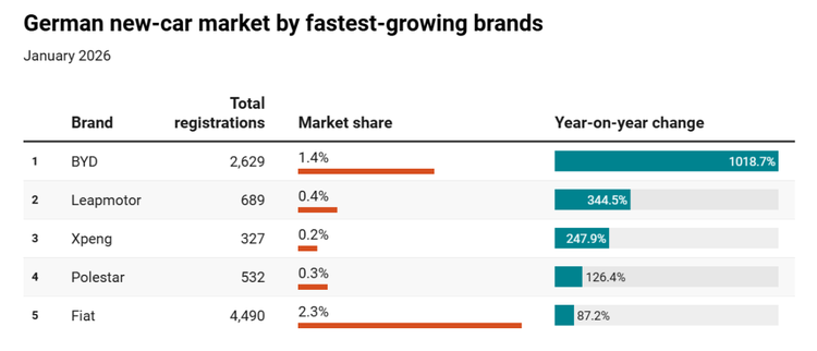 2026年1月,比亚迪在德国交出的成绩单,足以惊艳全球车市。根据德国联邦汽车运输管理局(KBA)最新发布的官方数据,比亚迪当月在德国售出2629辆新车,而去年同期这个数字仅为235辆,同比增幅高达1018.7%,相当于一年时间增长了10倍还多。