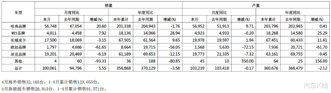 进入4月,长城汽车销量仍不温不火,单月整体销量勉强突破10万辆,同环比分别增长5.55%和2.11%。在《汽车K线》统计的4月中国主要上市车企销量排名中位列第10。今年前四个月,长城汽车累计销量为35.69万辆,同比下滑3.58%。具体到各品牌,仅魏牌和长城皮卡的累计销量实现同比增长。其中魏牌累计销售1.81万辆,同比增长28.94%,但这距离撑起长城汽车总体销量的增长,尚有很长的距离。当然,长城汽车的4月销量也并非没有亮点。哈弗品牌单月销售5.67万辆,同比增长20.6%;海外市场年累计销售12.31万辆,同比增长7.7%。