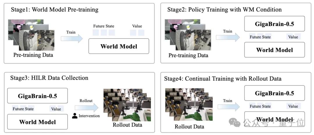 基于世界模型的强化学习的训练范式在GigaBrain-0.5M*的研发中,极佳视界团队提出基于世界模型的强化学习范式,并采用迭代式四阶段闭环训练流程: