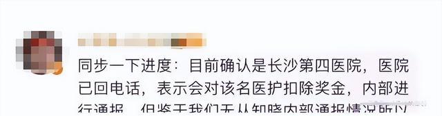 长沙第四医院目前已回电,表示会扣除这名医护的奖金,并在内部进行通报,其余的消息大家也无从知晓。