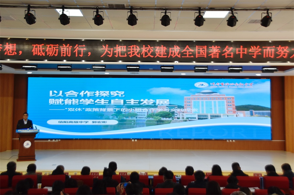 郭宏彬老师以《以合作探究赋能学生自主发展——“双休” 政策背景下的小组合作学习实践探索》为题,分享了信阳高中在自主探究学习方面的改革经验。郭老师从教育改革、高考命题转型、双休政策落地等现实需求出发,详细介绍了信阳高中“课堂内外”双轨并行的改革举措。