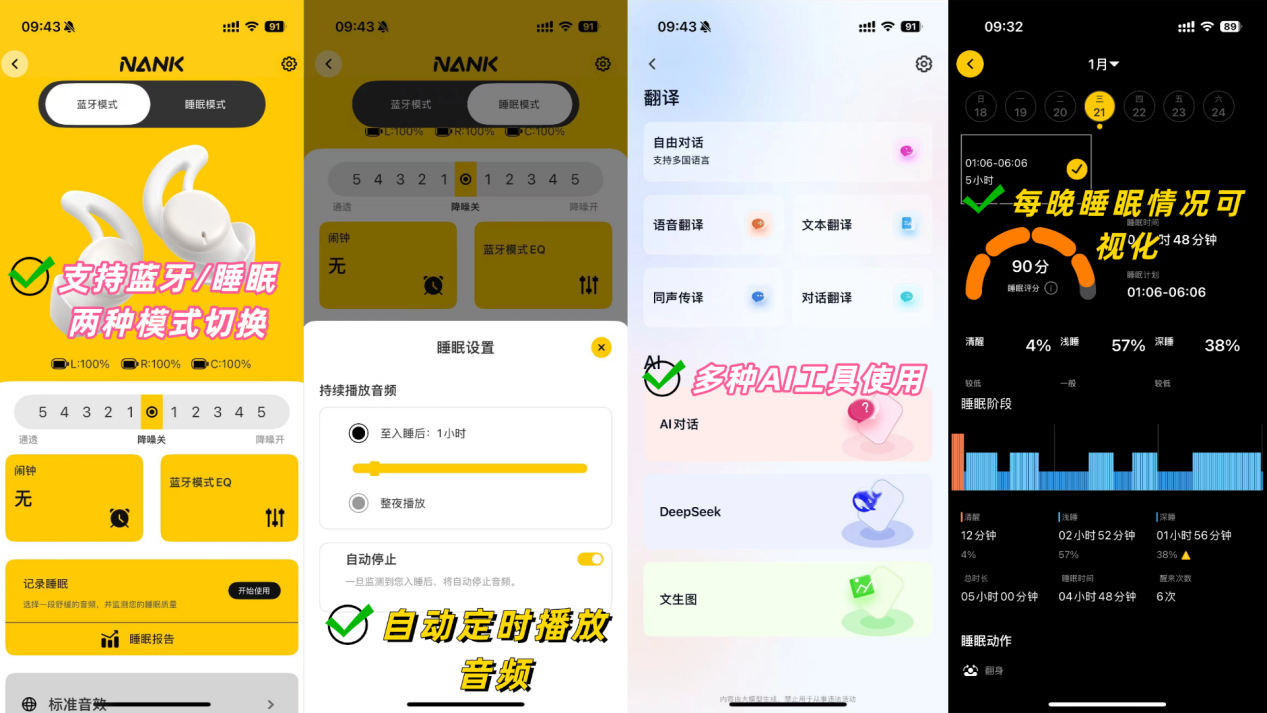 南卡DeepSleep的降噪,远比普通睡眠耳机更懂睡眠需求!它跳出了“硬隔音”的误区,先由BioShell三层仿生腔体筑牢物理降噪防线,再交给ANC降噪引擎做精细化处理。低频呼噜、空调声,中频人声、高频杂音被层层拆解抑制,安静感稳定又自然,既不会忽大忽小,也不会产生压迫耳感。双耳6麦阵列全面捕捉环境噪声,让降噪效果更持久稳定,哪怕整夜佩戴也能始终沉浸在静谧中。同时,配套APP搭载NANK DeepSleep算法,精准追踪深睡、浅睡、清醒阶段与睡姿,入睡后自动关闭音频播放,醒来用轻柔闹钟唤醒,生成的可视化睡眠报告能清晰呈现睡眠时长与质量,让每一次入睡和苏醒都有科学依据,助眠效果直观又可信。